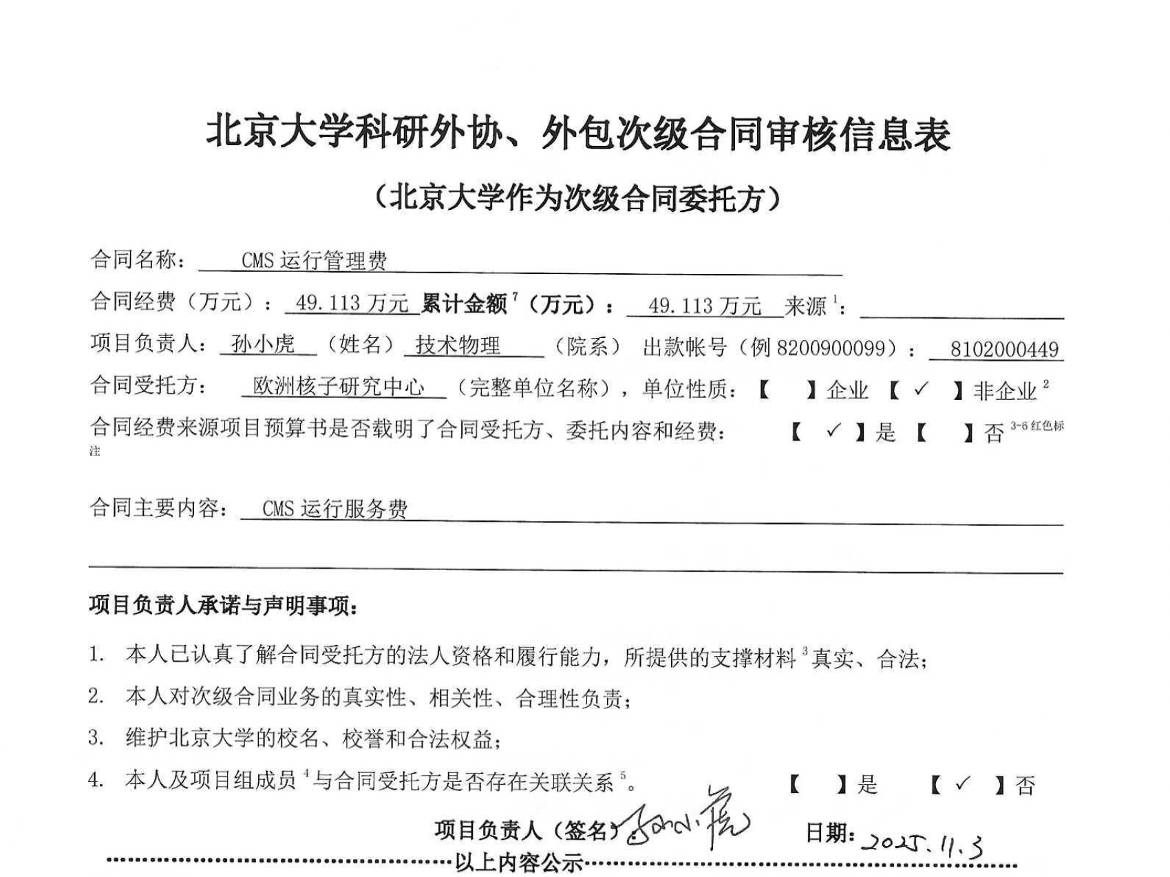 根据《关于北京大学理工科科研次级合同管理的通知》,现将北京大学理工科科研次级合同“CMS 运行管理费同经费”相关内容予以公示。