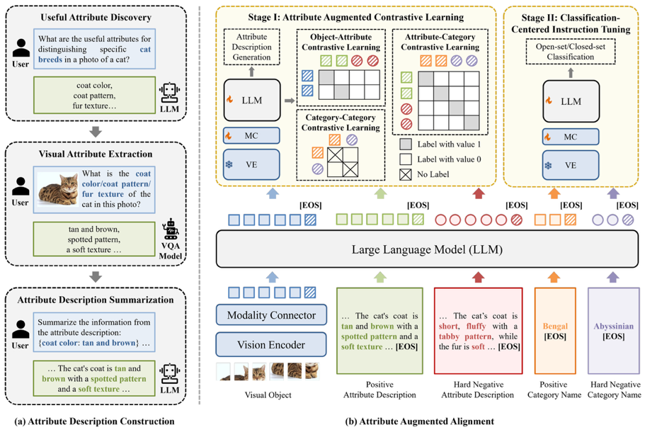 针对现有大模型无法准确区分细粒度类别的问题,团队研发并开源了首个细粒度多模态大模型Finedefics,首先通过与大模型的多轮交互构建细粒度子类别的属性知识,然后通过判别-生成统一的指令微调将属性知识分别与细粒度子类别的图像与文本对齐,实现数据-知识协同训练,提高了多模态大模型的细粒度图像分类能力,准确率达到76.84%,相比阿里的通义千问大模型(QwenVL-Chat)提高了9.43%,相比HuggingFace的Idefics2大模型提高了10.89%。本工作发表于人工智能领域国际顶级会议ICLR 2025。