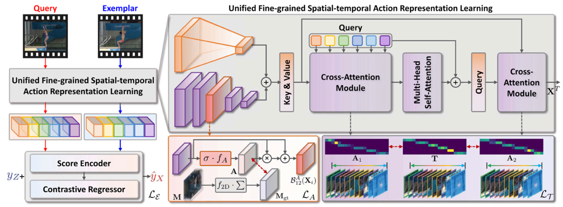 针对运动视频中人体动作难以分析的问题,团队提出了以人为中心的细粒度人体动作质量评估方法Uni-FineParser,通过聚焦前景目标动作区域,提取以人为中心的动作表征,然后通过细粒度对比回归将动作过程分解为连续的动作步骤,量化每个动作步骤的质量,综合各步骤质量差异预测最终动作质量得分,动作得分的斯皮尔曼相关系数达到95.01%。本工作发表于人工智能领域国际顶级期刊IEEE TPAMI(影响因子18.6)。
